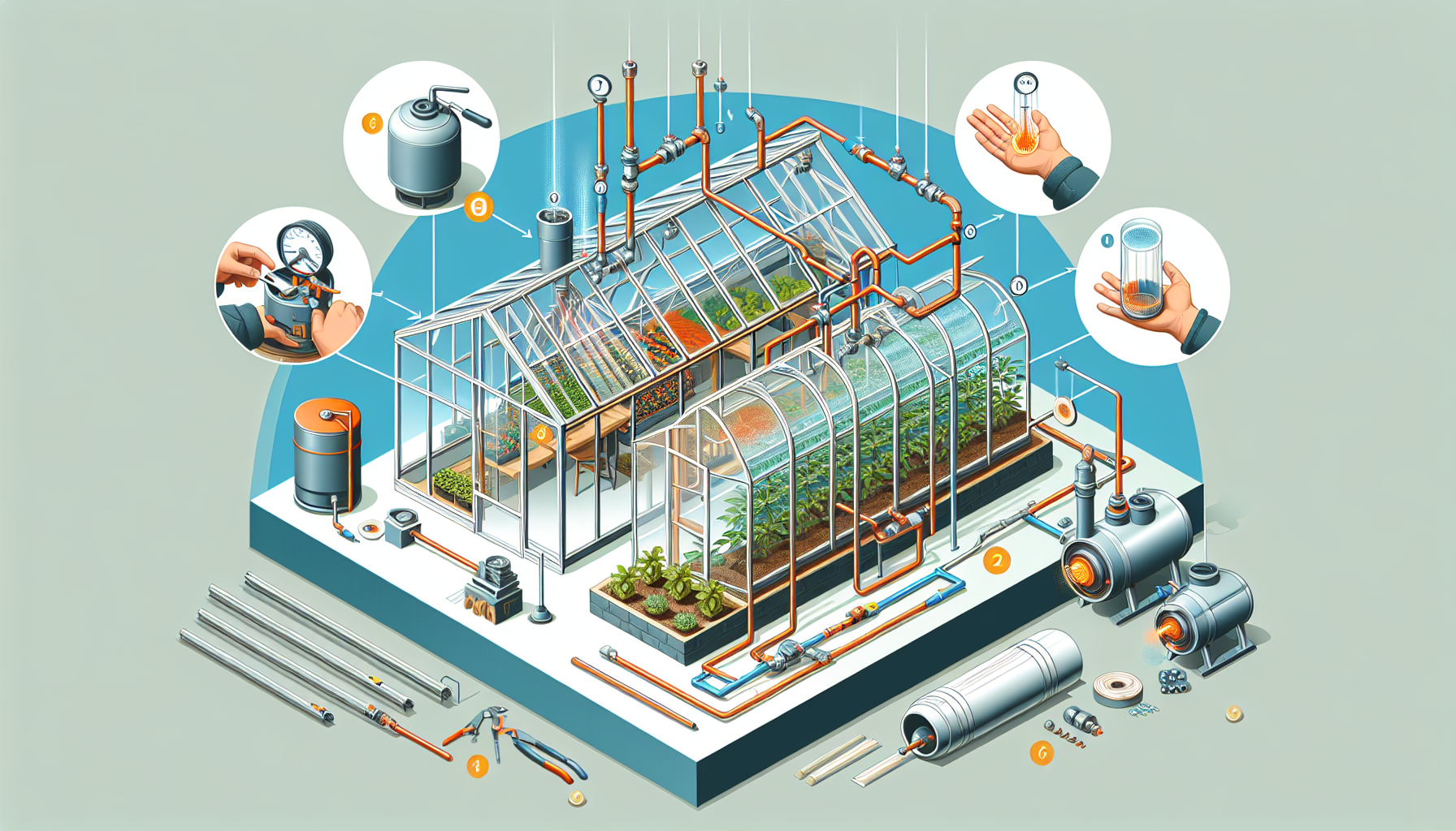 Первым шагом является установка котла и трубопроводов. Котел — это сердце отопительной системы, и его выбор зависит от размера теплицы и требуемой мощности. Существует множество вариантов котлов, таких как газовые, электрические и твердотопливные. После выбора и установки котла, необходимо провести монтаж трубопроводов. Трубы должны быть проложены таким образом, чтобы обеспечить равномерное распределение тепла по всей площади теплицы. Особое внимание следует уделить изоляции труб, чтобы минимизировать теплопотери.